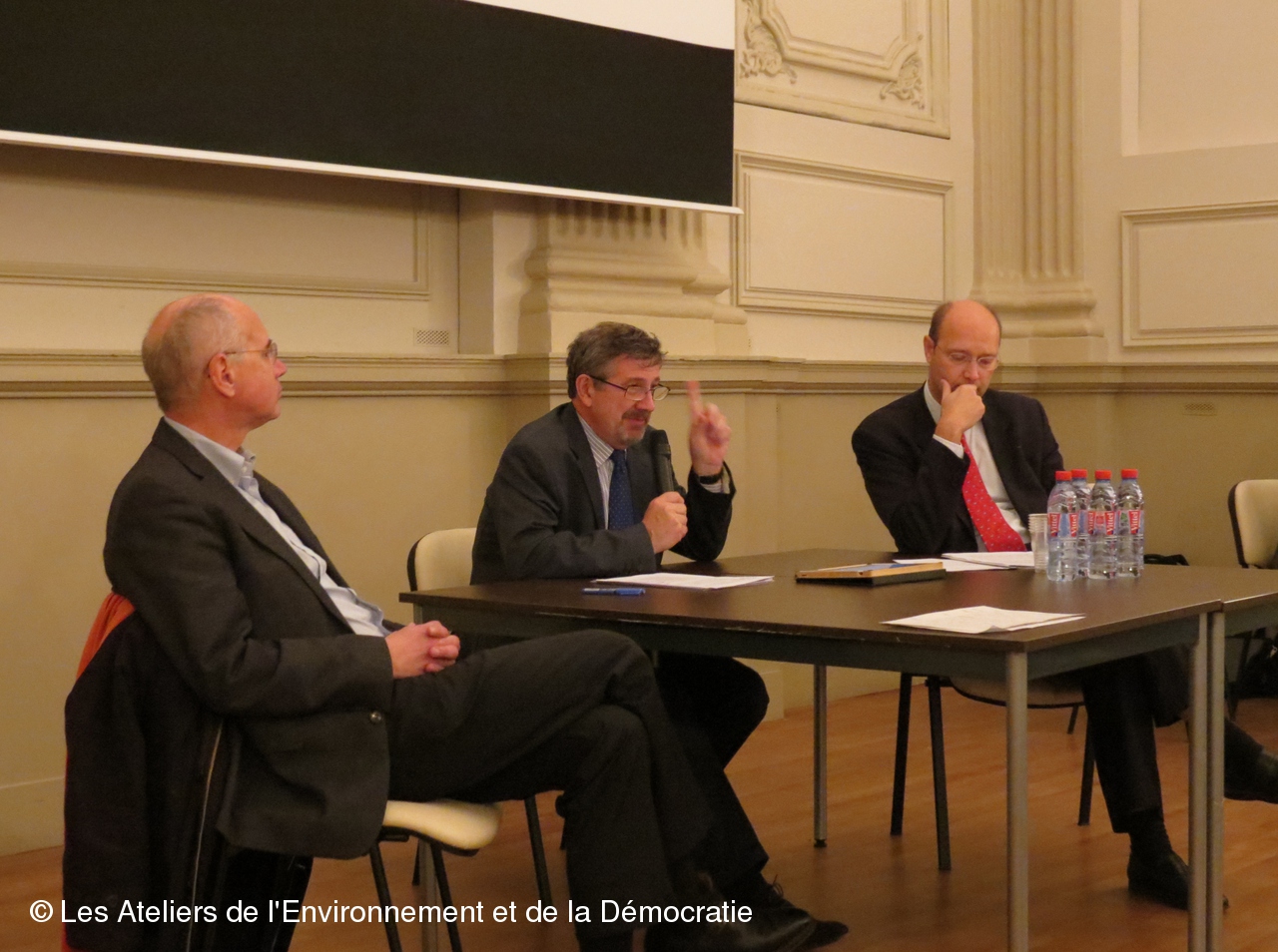 Henri de Russé, animateur du débat, avec Dominique Venet à sa droite et Thierry Trouvé à sa gauche.